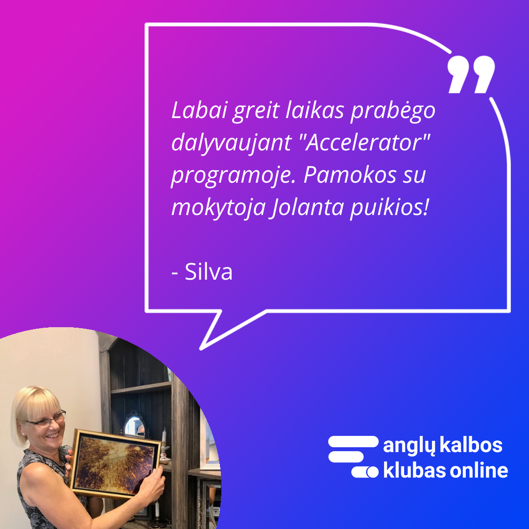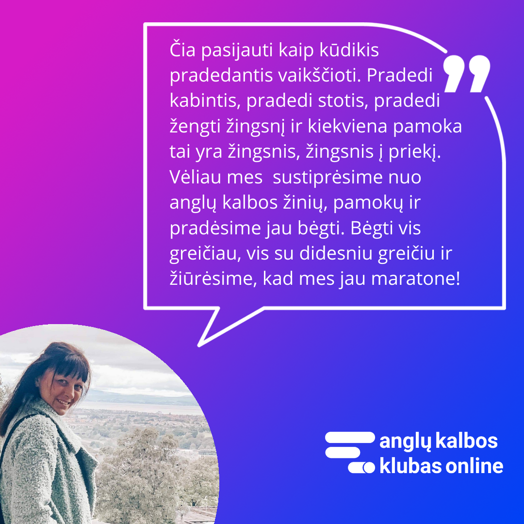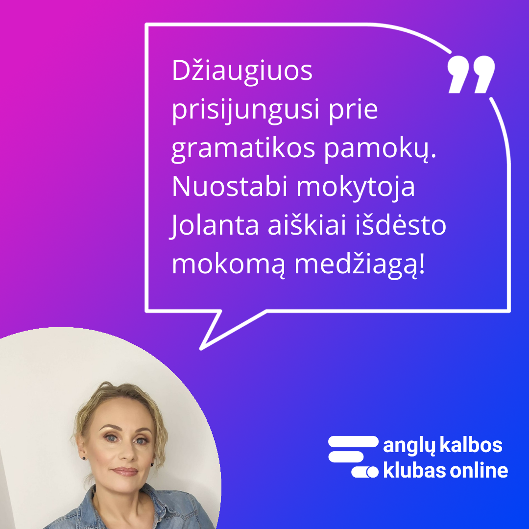 Priklausysite Anglų Kalbos Klubo Online bendruomenei - uždarai Facebook grupei, kurioje virš 1000 narių. Čia diskutuosite, žaisite, atliksite užduotis, užduosite rūpimus klausimus - ir visa tai bendraminčių būryje, kurie nori išmokti anglų kalbą kaip ir jūs.